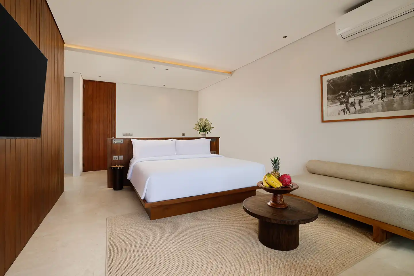Designed for comfort and privacy, the 1 Bedroom Pool Villa Garden View offers a spacious retreat with modern amenities and a private pool. The bedroom features warm wood finishes, a king-size bed, and direct access to a sunlit terrace with loungers and pool views.