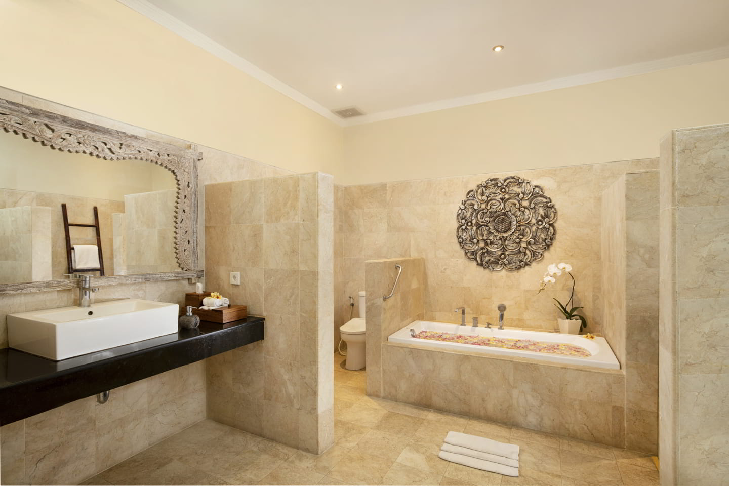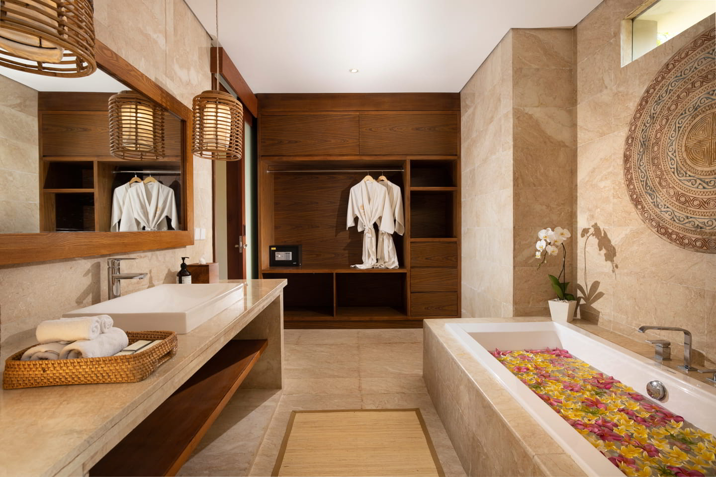 Enjoy panoramic view of lush tropical greenery from this 53 sqm suite, a serene Balinese-style home boasting Hollywood double bed , a private terrace, and an elegant bathroom design with a bathtub for a complete relaxation.